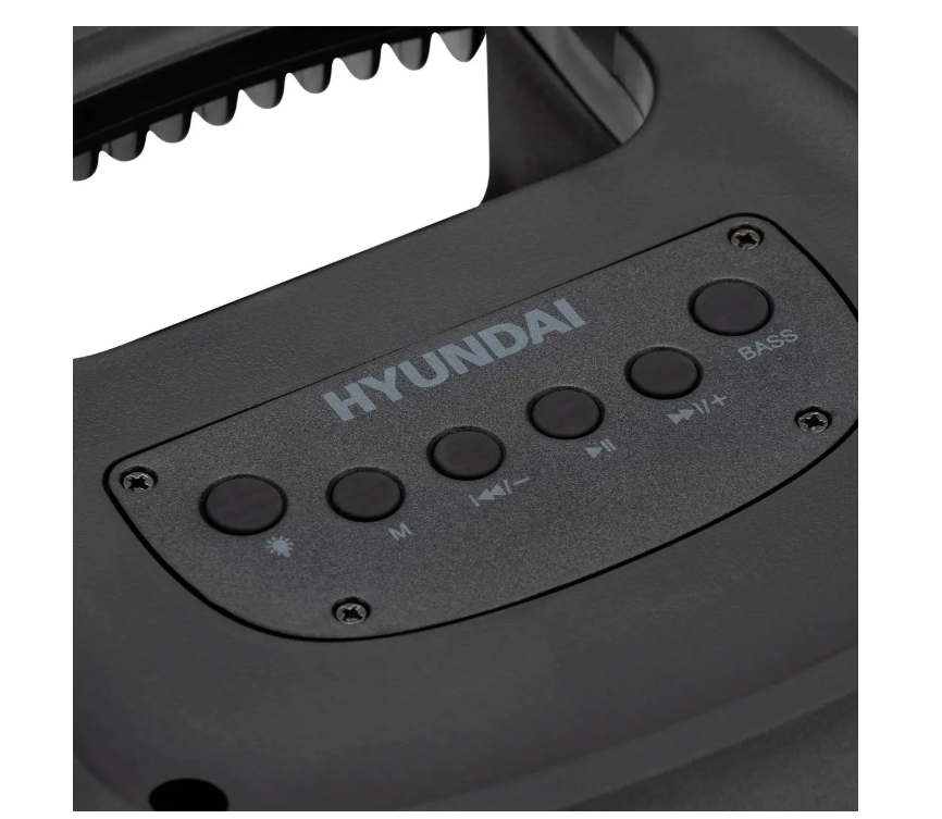 Аудиосистема Hyundai H-MC1230 18W FM USB BT microSD черный. Портативная акустическая система Hyundai H-MC1230 обеспечивает громкий и чистый звук на природе и дома. Переносная колонка – незаменимый девайс на домашних праздниках и пикниках. Стереодинамики Hyundai H-MC1230 выдают до 40 Вт звука – этого хватит для небольшого семейного мероприятия на улице или в помещении. Прибор поддерживает воспроизведение с карт памяти micro USB, флеш-накопителей, а также с любых устройств, способных подключаться по AUX. Также в данной модели предусмотрен вход для микрофона, чтобы петь караоке или вести вечеринку. Помимо этого, Hyundai H-MC1230 имеет встроенный радиоприёмник, который заменяет источник музыки. Все кнопки для управления устройством вынесены на его верхнюю панель. Однако с колонкой можно синхронизироваться и беспроводным способом – посредством Bluetooth. Такой метод позволяет не только удалённо менять очередь воспроизведения со смартфона, но и управлять другими параметрами прибора. В Hyundai H-MC1230 также встроена красочная подсветка, а корпус акустики выполнен таким образом, чтобы быть одновременно лёгким и компактным, - из современного пластика. На верхней части девайса расположена ручка, облегчающая переноску.