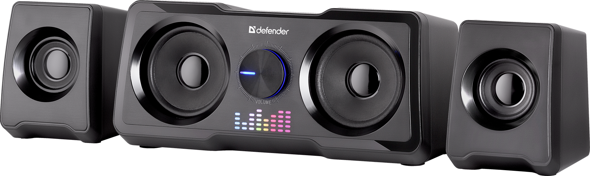 Игровая 2.1 акустическая система с разноцветной подсветкой и мощным басом. На передней панели расположен удобный регулятор громкости со встроенным выключателем питания и LED свечением.