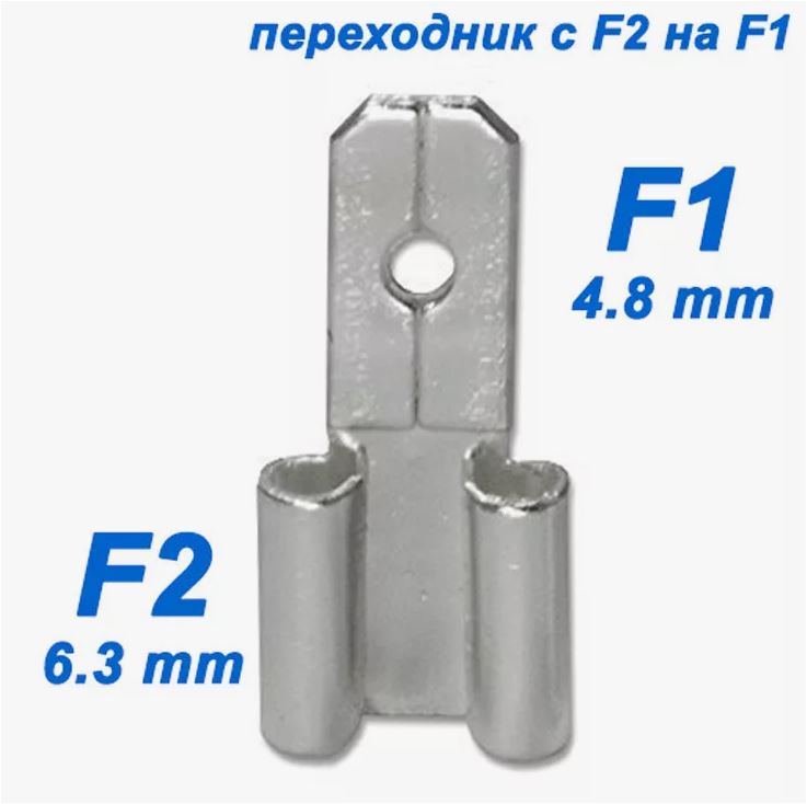 Переходник позволяет подключить провода с клеммами F1 (узкими) к батарее с клеммами F2 (широкими). Клеммы. F1 (6.35 x 4.75 мм) в сторону кабеля, F2 (7.95 x 6.35 мм) в сторону батареи.