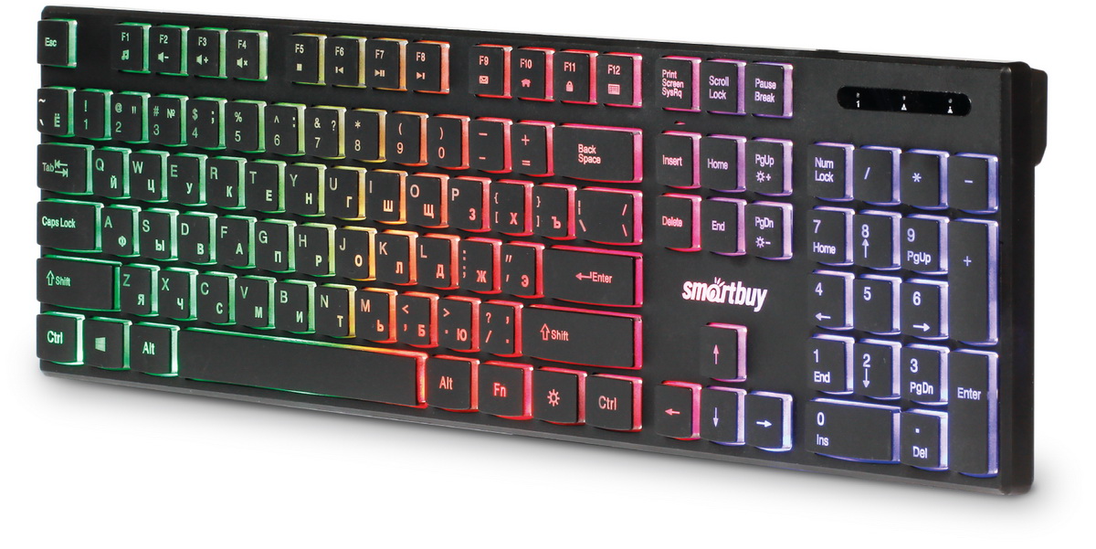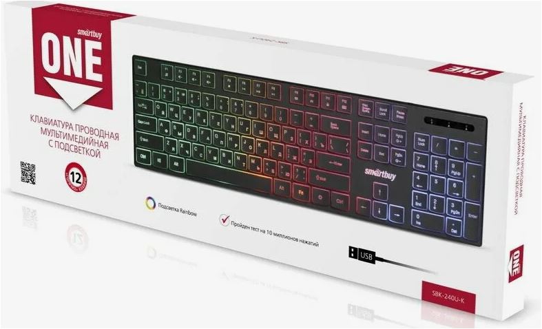 Клавиатура мультимедийная Smartbuy SBK-240U-K сочетает в себе эргономичный корпус, минималистичный дизайн и эффектную Rainbow подсветку (2 режима свечения FN+LED). Небольшой вес, лёгкость подключения, низкопрофильные клавиши с мягким ходом и приятным откликом. Прочный встроенный USB кабель. 12 мультимедийных клавиш. Характеристики. SBK-240U-K. Основной цвет. Черный.