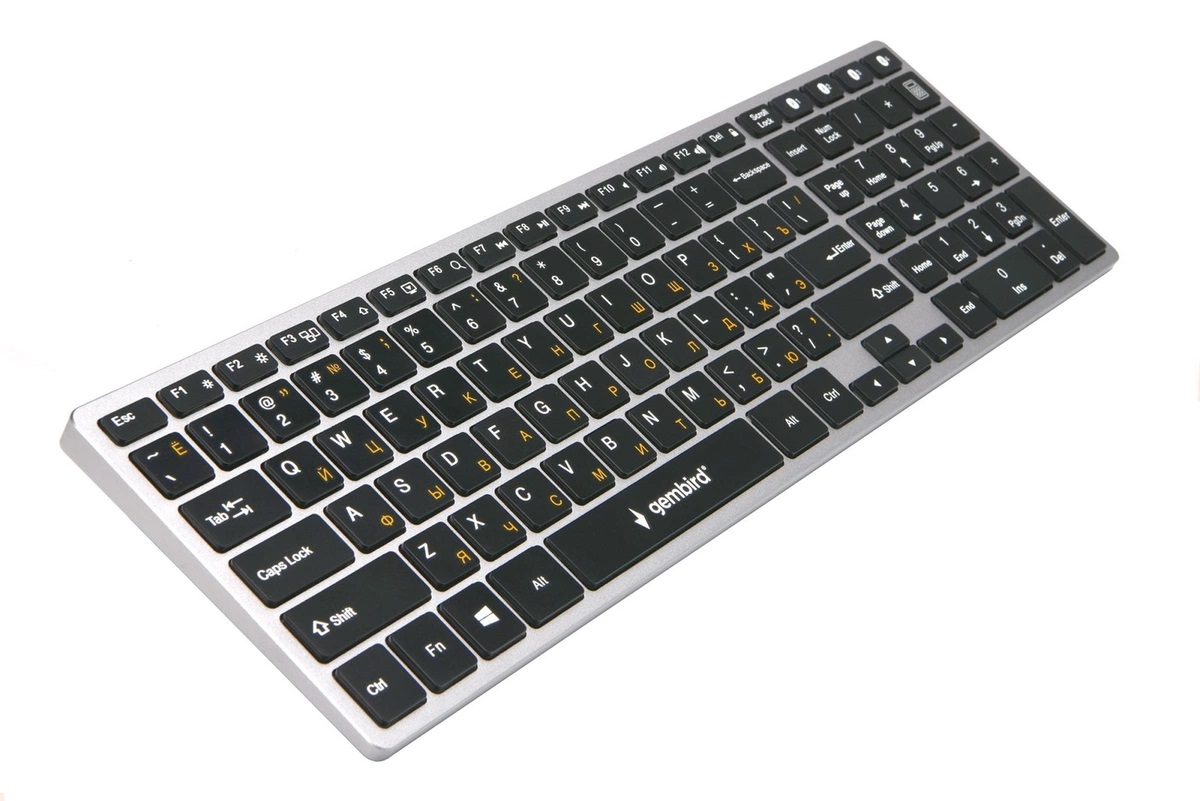 Беспроводная Bluetooth-клавиатура Gembird KBW-2 имеет компактный размер и предназначена для дома и офиса. Клавиатура получает энергоснабжение от встроенной литиевой батареи, 300 мА•ч, которая может работать без подзарядки до 4-х недель. Количество клавиш: 106.Размеры: 380,18*115*11,3 мм Вес: 442 г Особенности: Ножничный (бесшумный) механизм клавиш. Встроенный аккумулятор. Возможность сопряжения с четырьмя устройствами Клавиши управления громкостью