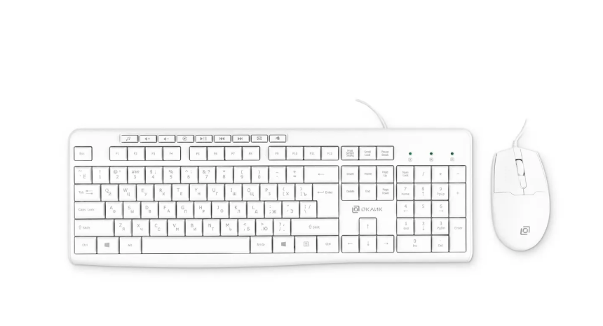 Комплект проводной (клавиатура+мышь) Оклик S650 Multimedia белый. В комплект Oklick S650 входят проводные клавиатура и мышь для комфортной работы дома и в офисе. Оба девайса выполнены в стильном белом цвете. Клавиатура оборудована 113 клавишами, из них 9 – вынесены в отдельный блок и предназначены для выполнения разных мультимедийных команд. Устройство отличается долгим сроком службы: выдержит до 10 млн нажатий. Благодаря эргономичной конструкции пользоваться моделью приятно и удобно. Влагозащитный корпус не боится попадания брызг или капель напитков. Есть регулируемые по высоте ножки. Мышь имеет обтекаемую симметричную форму, подходит для правой и для левой руки. У манипулятора 4 кнопки с ресурсом до 3 млн кликов. Модель поддерживает три режима разрешения оптического сенсора: 1000, 1600 и 2000 dpi. Это позволит с комфортом выполнять большинство офисных задач. Каждый из девайсов оснащен 1,5-метровым USB-кабелем для подключения к ПК.