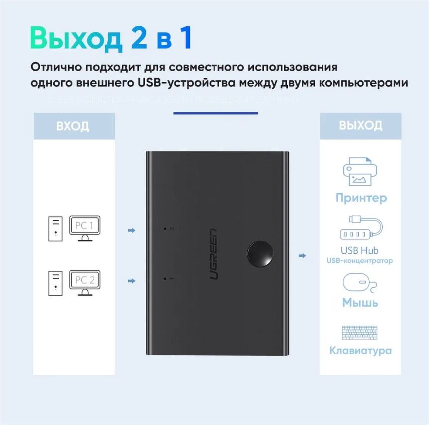 *USB sharing Hub обеспечивает простое переключение USB-устройства между двумя компьютерами одним касанием. Важное примечание: Для лучшей передачи данных, пожалуйста, держите USB-кабели (подключенные к устройствам ввода и вывода) Длина менее 3 м. * USB 2.0 Sharing Switch - отличное решение для совместного использования USB-устройств, таких как USB-принтер, сканер, плоттер, многофункциональный принтер, оборудование Bluetooth с двумя компьютерами * С помощью этого устройства 1 USB-устройство может использоваться совместно с 1-2 компьютерами, которые могут совместно использовать 1 принтер, благодаря чему мы можем сократить расходы на офисное оборудование и сэкономить много места. * Коммутатор работает с любым компьютером с поддержкой USB без драйверов, поэтому вы можете свободно переключаться между двумя компьютерами при подключении к USB-устройству одним нажатием кнопки. *Светодиодные индикаторы показывают, какой подключенный компьютер управляет подключенными устройствами. Комплектация Разветвитель портов