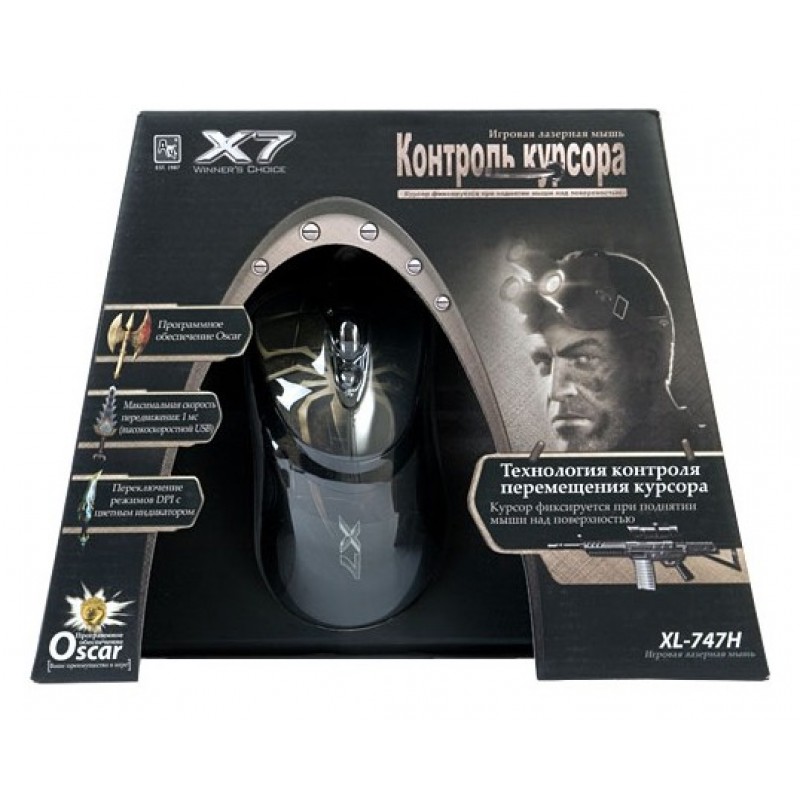 Проводная мышь A4Tech XL-750BH исполнена в стилистике компьютерной игры Predator. Модель отвечает основным требованиям геймеров к данному типу изделий. Устройство имеет классическую форму, корпус изготовлен по технологии Soft touch с добавлением прорезиненных элементов. Мышь легко управляется правой рукой, модель позволяет достигнуть отточенных движений. A4Tech XL-750BH оснащена семью элементами управления. Доступна опция перепрограммирования кнопок, что позволяет использовать мышь на других компьютерных устройствах без дальнейших дополнительных настроек. Датчик передвижения лазерного типа обеспечивает точность движения курсора. Доступны 6 режимов разрешения сенсора. Максимальный показатель достигает цифры в 3600 dpi. Соединение мыши с компьютерными устройствами осуществляется проводным способом через USB-интерфейс. В комплектацию к приспособлению входит ПО и наклейки.