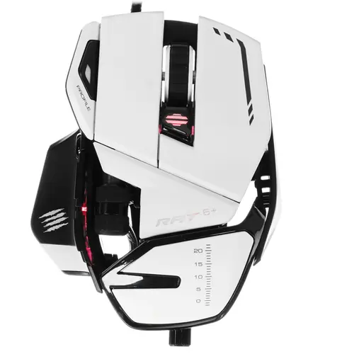 Мышь проводная Mad Catz R.A.T. 6+ представлена в стильном игровом дизайне белого корпуса из металла и пластика с контрастными черными элементами. Устройство дополнено яркой RGB-подсветкой. Предусматривается наличие 11-ти программируемых клавиш. Особенностью конструкции является наличие системы регулирования веса. Устройство Mad Catz R.A.T. 6+ оснащено собственным сенсором PixArt PMW3360 с четырьмя рабочими режимами и предельным разрешением датчика 12000 dpi. Мышь удобна для удержания правой рукой, а ее вес составляет 143 г. Прибор подключается при помощи кабеля длиной 1.8 м с USB-разъемом и питанием по шине. Рабочий ресурс мыши достигает 20 млн нажатий.