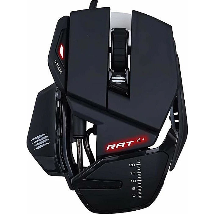 Мышь проводная Mad Catz R.A.T. 4+ – стильная игровая модель с белым корпусом, контрастными черными элементами и яркой красной подсветкой. Кабель дополнен прочной тканевой оплеткой, защищающей от изломов и перегибов. Предусматривается наличие семи клавиш, включая программируемые кнопки. Устройство Mad Catz R.A.T. 4+ оснащено собственным сенсором Pixart PMW3330 с высокой чувствительностью и четырьмя режимами работы датчика с разрешением до 7200 dpi. Пластиковая конструкция разработана для хвата правой рукой, дополнена кабелем длиной 1.8 м с USB-разъемом и питанием по шине. Особенностью данной модели является возможность изменения габаритов, а также рабочий ресурс кнопок, достигающий 10 млн нажатий.