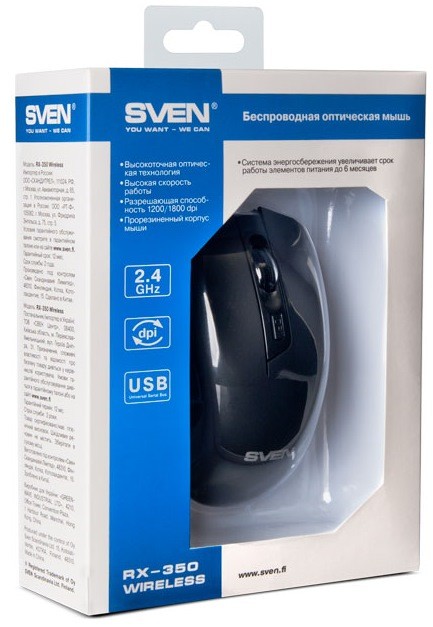 Мышь беспроводная Sven RX-350W эргономичной формы имеет небольшой вес и оптимальна для управления правой рукой. Для более точного позиционирования пользователь может выбрать один из нескольких режимов dpi до максимального значения 1400. Мышь беспроводная Sven RX-350W изготовлена из прочного пластика и имеет приятное на ощупь soft-touch-покрытие. Поверхность предотвращает выскальзывание даже из влажных ладоней и обеспечивает комфортные условия эксплуатации. В конструкции предусмотрено 6 кнопок, которые подходят для выполнения быстрых действий. Модель способна в течение года работать от двух батареек типа ААА.