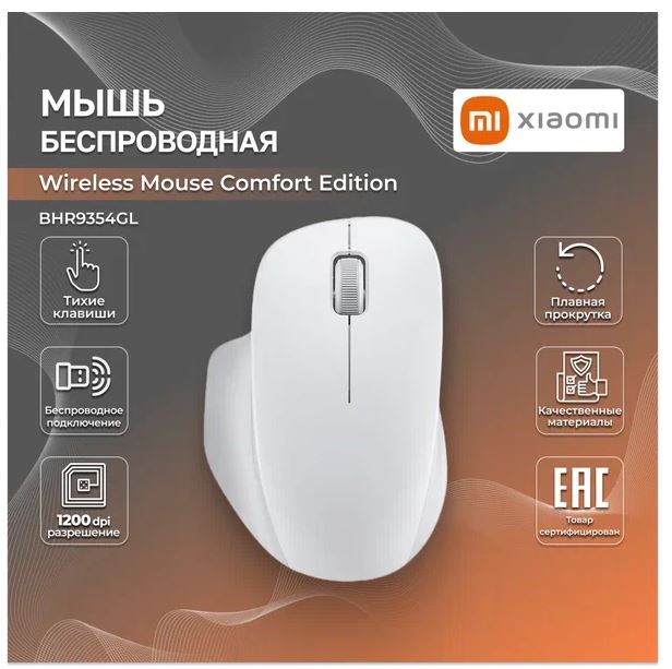 BHR9354GL — беспроводная мышь Xiaomi Wireless Mouse Comfort Edition, разработанная для правшей. Некоторые характеристики: Оптический сенсор с разрешением 1200 dpi обеспечивает высокую точность. Микропереключатели TTC Light Touch Switch требуют минимального усилия для срабатывания, что снижает нагрузку на пальцы и делает нажатия практически бесшумными. Подключение осуществляется по радиоканалу 2,4 ГГц, что гарантирует надёжную связь на расстоянии. Матовая нескользящая поверхность придаёт мыши элегантный вид и позволяет избежать скольжения во время работы. Прорезиненное колесо прокрутки обеспечивает чёткое тактильное ощущение и контроль во время прокрутки документов и страниц. Тефлоновые глайды на нижней поверхности устройства способствуют лёгкому и плавному скольжению по коврику. Комплектация: USB-ресивер, документация. Габариты: ширина — 7,5 см, высота — 4,6 см, длина — 11,1 см. Вес: 62 г. Мышь совместима с Windows 10, macOS 10.13 и более поздними версиями