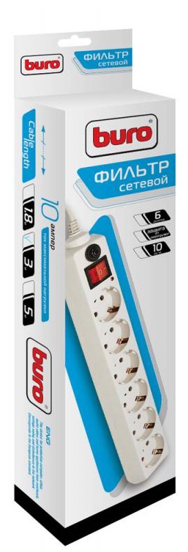 Сетевой фильтр Buro 600SH-3-W рассчитан на шесть посадочных мест. Этого количества гнезд обычно хватает для подключения периферийных устройств к персональному компьютеру. Также фильтр можно использовать и для бытовой техники при подключении к отечественным электросетям, если шнуры оснащены штепселями \"евростандарта\". Фильтр защитит технику от всплесков напряжения, перегрузок и импульсных помех в электросети благодаря автоматическому предохранителю от перегрузок (10 Ампер). Выключатель с индикатором помогает осуществить комплексное отключение питания всех устройств одновременно, что очень удобно.