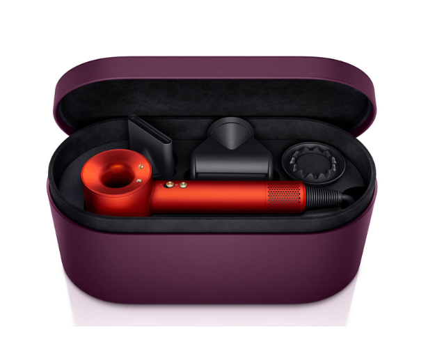 Фен Dyson Supersonic HD08 — Модель поддерживает четыре температурных режима, включая холодный обдув, и три скорости подачи воздуха. Кнопки управления расположены на ручке. При перегреве срабатывает система автоматического отключения. В комплекте насадки разной формы (диффузор, гребень, концентратор и насадка для бережной сушки) и кейс для удобного хранения всего комплекта. Фен работает от сети, длина кабеля — 2,8 м. Мощность устройства — 1,6 кВт.
