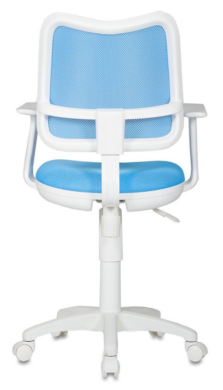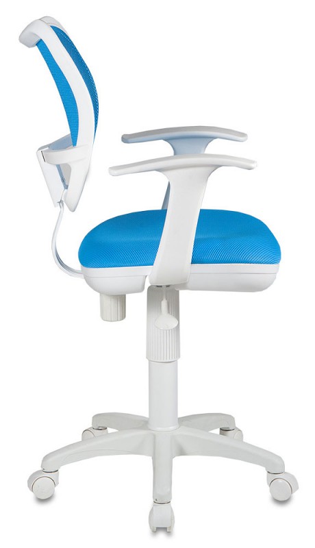 Эргономичное детское кресло Бюрократ CH-W797/LB/TW-55 c сетчатой обивкой спинки голубого цвета, белым каркасом, Т-образными белыми пластиковыми подлокотниками, регулировкой высоты (газлифт), пружинно-винтовым механизмом качания спинки, ограничением по весу: 120 кг.