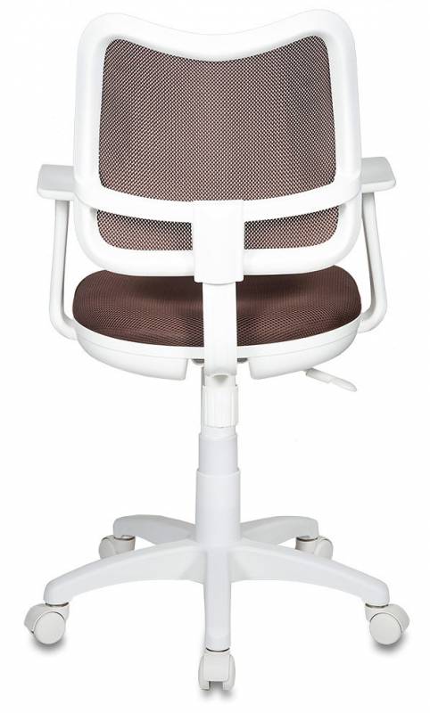 Эргономичное детское кресло Бюрократ CH-W797/BR/TW-14C c сетчатой обивкой спинки коричневого цвета, белым каркасом, Т-образными белыми пластиковыми подлокотниками, регулировкой высоты (газлифт), пружинно-винтовым механизмом качания спинки, ограничением по весу: 120 кг.