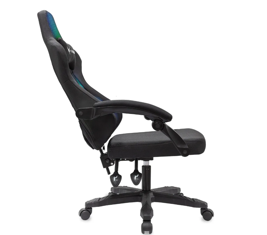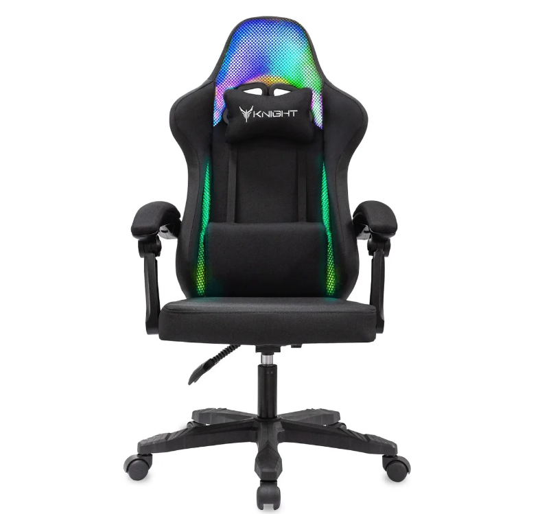 Кресло Knight Wolf RGB (ткань, фиксация наклона спинки в любом полож., крестов. пластик, до 120 кг) черный. Современное игровое кресло. Конструкция: Фиксация наклона спинки в любом положении. Регулировка спинки по высоте. Встроенная подсветка с управлением с помощью пульта. Поддержка поясничной и шейной областей (2 подушки). Регулировка высоты (газлифт). Подвижные подлокотники с мягкими накладками. Крестовина пластик. Колеса пластиковые. Ограничение по весу: 120 кг.