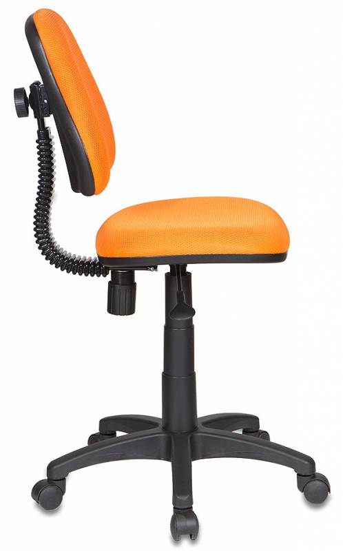 Детское кресло Бюрократ KD-4/TW-96-1 c обивкой из ткани оранжевого цвета, черным каркасом, регулировкой высоты (газлифт), ограничением по весу: 100 кг. Среди отличительных особенностей данной модели являются: пружинно-винтовой механизм качания спинки, сиденье имеет 2 варианта сборки (перемещается относительно платформы), за счет этого меняется глубина сиденья. Спинка пружинит и перемещается вверх-вниз по опоре. Присутствует регулировка под вес.