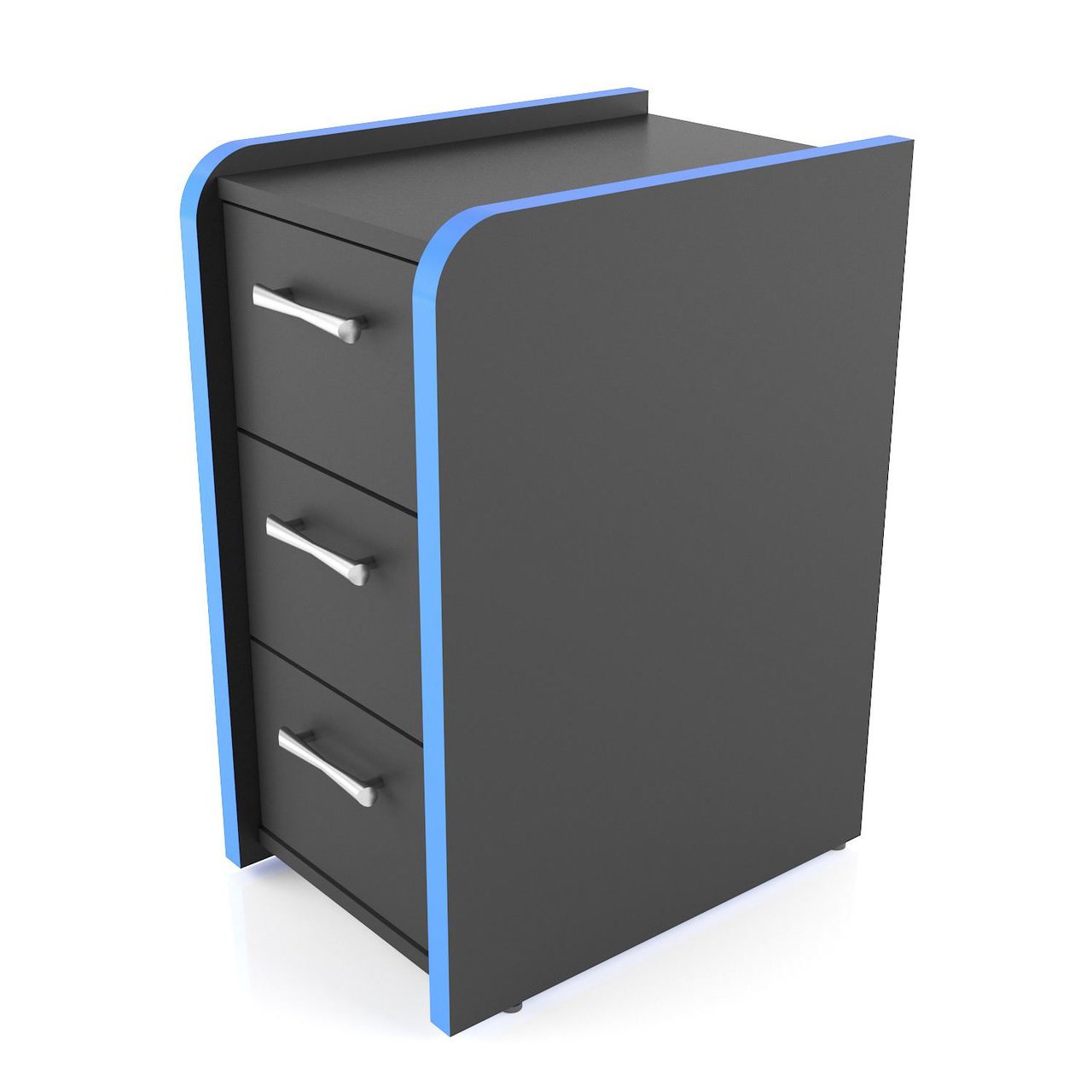 Тумба под игровой стол MaDXRacer изготовлена из прочного ЛДСП и оснащена тремя ящиками. Благодаря специальной кромке, выполненной из ПВХ, тумба отличается высокой прочность и защищена от случайных ударов. Ящики расположены на шариковых направляющих полного выдвижения. Данная модель подходит как для самостоятельного использования, так и для использования совместно со столами фирмы MaDXRacer и относящимся к сериям - COMFORT, XGAMER, ARENA и GAMING DESK. Данная тумба под игровой стол MaDXRacer выполнена в черном цвете со вставками синего цвета. Вес данной модели равняется 25 кг.