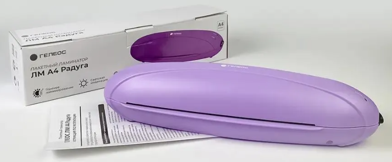 Ламинатор ГЕЛЕОС ЛМ А4, 2х150 (пленка 75-150 мкм), 2 вала, Фиолетовый Модель ЛМ-А4РФ Максимальный формат документа A4 Толщина пленки 75-150 мкм Ширина загрузочного слота 237 мм Толщина документа MAX 0.6 мм Время нагрева 6 мин Скорость ламинирования 25 см/мин Количество валов 2 Система нагрева нагреваемые валы Сигнал готовности световой Возможность ламинировать фотографии Да