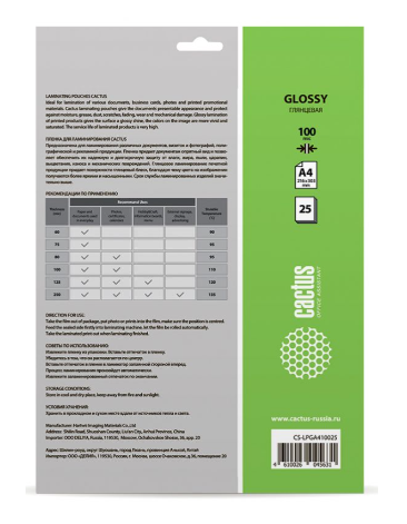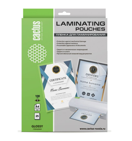 Пленка предназначена для ламинирования различных документов, визиток и фотографий, полиграфической и рекламной продукции. Пленка придает документам опрятный вид и позволяет обеспечить их надежную и долгосрочную защиту от влаги, жира, пыли, царапин, выцветания, износа и механических повреждений. Срок службы ламинированных изделий значительно выше, чем у аналогичных. Глянцевое ламинирование печатной продукции придает поверхности глянцевый блеск, благодаря чему цвета на изображении получаются более яркими и насыщенными.