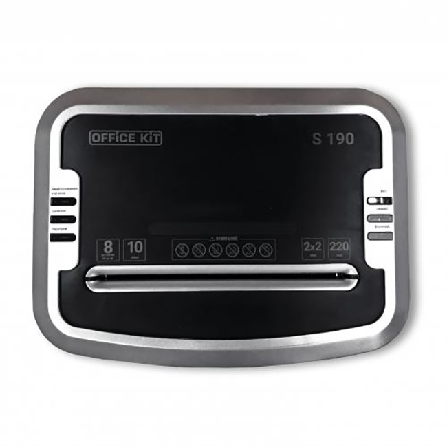 Office Kit S190 - стильный уничтожитель с высоким уровнем секретности P6. Обладает неоспоримыми преимуществами. Модель с увеличенной мощностью - одновременное уничтожение 8 листов. Увеличенный цикл работы - 10 минут непрерывной работы. Световая индикация. Защита от перегрева и низкий уровень шум.а Уничтожение конфиденциальной информации. Автоматическое управление. Стильный и лаконичный дизайн.