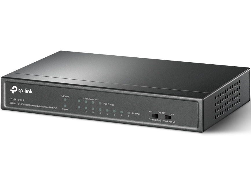 TP-LINK TL-SF1008LP - компактный, неуправляемый, 8-портовый коммутатор с поддержкой PoE на 4 портах (802.3af; бюджет до 41 Вт). Коммутатор поддерживает передачу питания по PoE на расстояние до 250 метров, предназначен для инсталляции в системах видеонаблюдения.