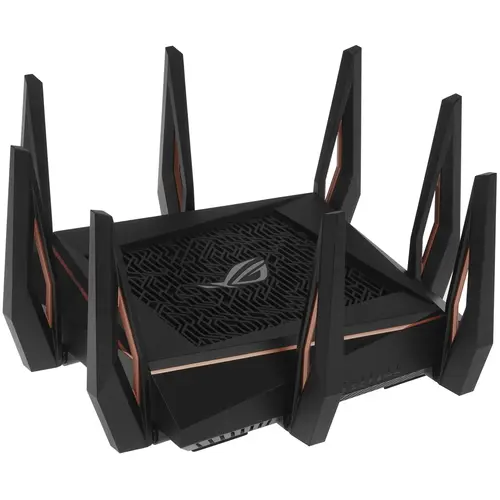 Маршрутизатор ASUS GT-AX11000 в черном корпусе обеспечивает беспроводное подключение пользовательских устройств, гарантируя скорость Wi-Fi-соединения до 5952 МБит/сек по обоим диапазонам (2.4 и 5 ГГц). При подключении 3G- или 4G/LTE-модема это производительное сетевое решение поддерживает беспроводное подключение к Интернету с использованием мобильных сетей. Внешние несъемные антенны в количестве 8 штук обеспечивают стабильность подключения смартфонов, планшетов и другой техники по Wi-Fi. Маршрутизатор ASUS GT-AX11000 получил в общей сложности 5 гигабитных LAN-портов для кабельного подключения как компьютеров, так и любого другого стационарного оборудования. Устройство располагает интерфейсами USB 3.1 x2, с помощью которых вы сможете организовать файловый сервер или принт-сервер. Настройку рабочей конфигурации точки доступа вы сможете выполнить через Web-интерфейс. Прибор поставляется в комплекте с адаптером питания.