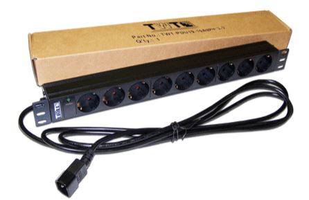 Блок сетевых розеток предназначен для распределения электропитания и защиты компьютеров, электронной техники и активного оборудования, оснащенных вилками немецкого стандарта Schuko, в телекоммуникационных шкафах и стойках. Блок позволяет решить проблемы недостаточной длины шнуров питания оборудования, удобства доступа и обслуживания. Блок оснащен 1 розеткой С14 для подачи напряжения и 8 розетками под вилки немецкого стандарта (тип F, CEE 7/7 Немецкий 16 А/250 В, с заземлением), для подключения внешнего оборудования. В состав блока входит устройство защитного отключения. Розеточные гнезда имеют защитные шторки и заземляющий контакт. Блок розеток имеет высоту 1U и может монтироваться в стандартные 19\" шкафы и стойки. Выключатель питания выполнен с подсветкой. Напряжение питания 220В Суммарный ток нагрузки не более 10А. Габаритные размеры (ШхВхГ) - 485х44х46 мм