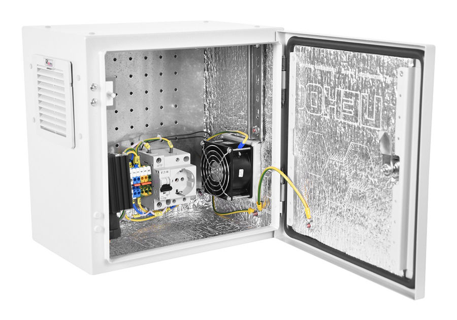 Шкафы серии ШТВ-НЭ укомплектованные предназначены для размещения систем видеонаблюдения, систем безопасности и телекоммуникационного оборудования. Шкафы используются для размещения автономно функционирующего активного и пассивного телекоммуникационного оборудования, обеспечивают защиту от воздействия окружающей среды и несанкционированного доступа, а также поддерживают температурно-влажностный режим внутри шкафа. Изделие рассчитано на питание от сети переменного тока 230 В частотой 50 Гц. Изделие имеет климатическое исполнение У 1 по ГОСТ 15150-69 и предназначено для уличной эксплуатации при температуре от минус 50 до плюс 45 °С при относительной влажности не более 80 % при 20 °С. Шкаф крепится на стену при помощи 4 уголков (анкеры не входят в комплект поставки), при необходимости можно применить крепление на столб ККС-ШТВ-НЭ (не входит в комплект поставки). В качестве дополнительной защиты от вредных факторов окружающей среды, можно устанавливать крышу дождевую модели КД-ШТВ-НЭ (не входит в комплект поставки), а в комплектации Т1 для защиты вентилятора и выпускного фильтра можно устанавливать козырьки защитные КЗ-ШТВ-НЭ (не входят в комплект поставки). В основании шкафа предусмотрены круглые отверстия для ввода кабелей, выполненные методом формования. В зависимости от размера подводимого кабеля, необходимо удалить заглушку подходящего размера и завести кабель внутрь шкафа через гермоввод подходящего размера типа MG12, MG20, MG32 (в комплект поставки не входят). Конструкция заглушек предполагает разное количество отверстий различного диаметра для установки кабельных вводов по потребностям заказчика. За счёт имеющихся отверстий, шкафы легко можно крепить вертикально по два и более штук. При этом перевесив дверь нижнего шкафа, шкафы можно сориентировать кабельными вводами друг к другу, что позволит свободно прокладывать кабеля между шкафами. Cтепени защиты, обеспечиваемой оболочками от наружного механического удара - IK 10.