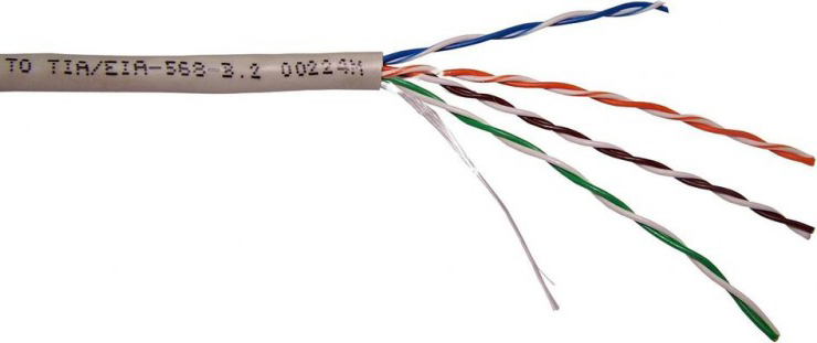 Кабель NM-UTP5E4PR-CCA, 4 пары, Кат.5e, PVC, серый, 305 метровКабель произведено из 4-х пар одножильных медных проводников. Поперечник проводника 24AWG. Любой проводник заключен в изоляцию HDPE (полиэтилен высочайшей плотности). 2 проводника, скрученных со нарочно выбранным шагом, оформляют 1 витую пару. 4 витых пары обернуты полиэтиленовой пленкой и совместно с медным заземляющим проводником заключены в артельный экран из фольги и оболочку из PE (полиэтилен).