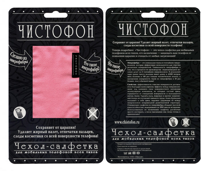 Чистофон – это чехол-салфетка из микрофибры для мобильных телефонов всех типов. Его назначение – защищать цифровые устройства от появления царапин и очищать от любых загрязнений.