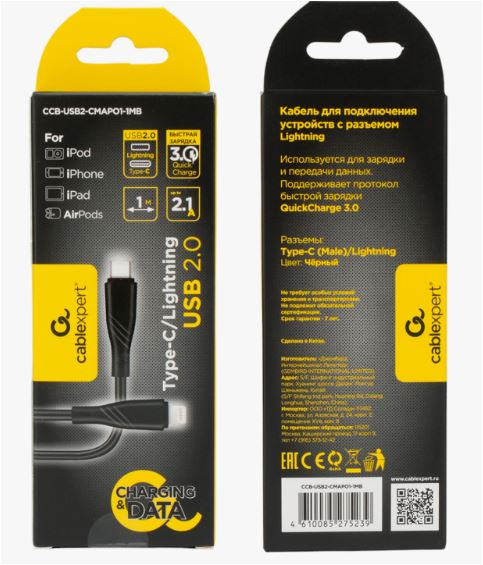 Особенности USB Type C to Lightning, кабель для зарядки и передачи данных в ритейл-упаковке. Технические характеристики Интерфейс: USB 2.0 Разъемы: тип (папа) - тип C (папа) Скорость передачи данных: до 480 Мбит/сек Сила тока: до 3 А Длина: 2м Цвет: чёрный Поддерживаемые стандарты быстрой зарядки: Q.C 2.0/3.0;