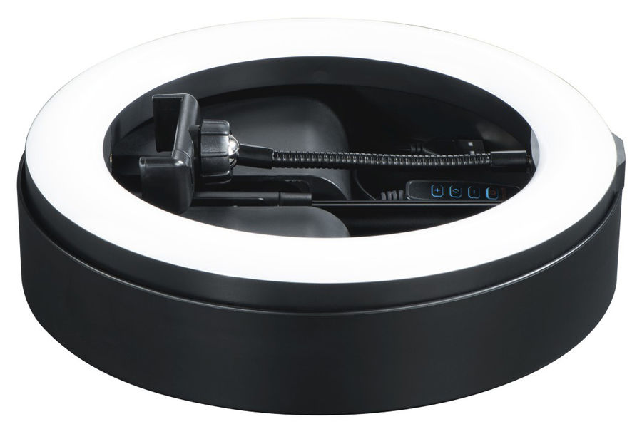 Кольцевая лампа Hama SpotLight FoldUp 102 с трехступенчатой регулировкой цветовой температуры. Данная модель имеет 10 ступеней регулирования интенсивности света. Кольцевую лампу можно сложить и хранить в подставке, такая функция будет полезна для блоггеров и влогеров, которые часто находятся в дороге.