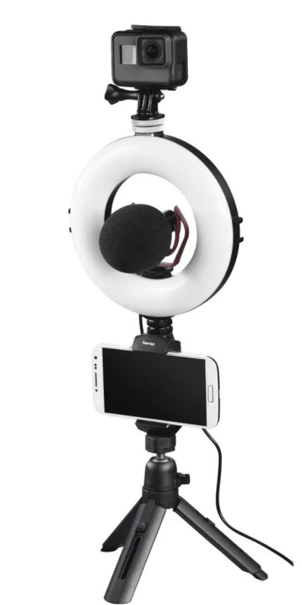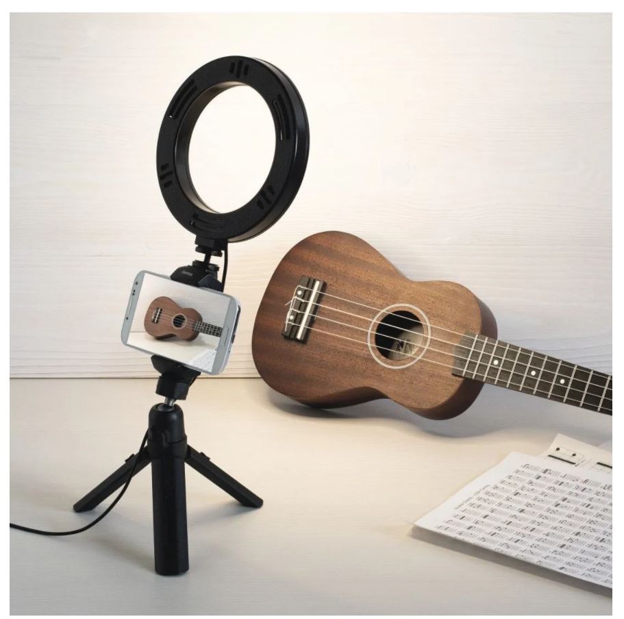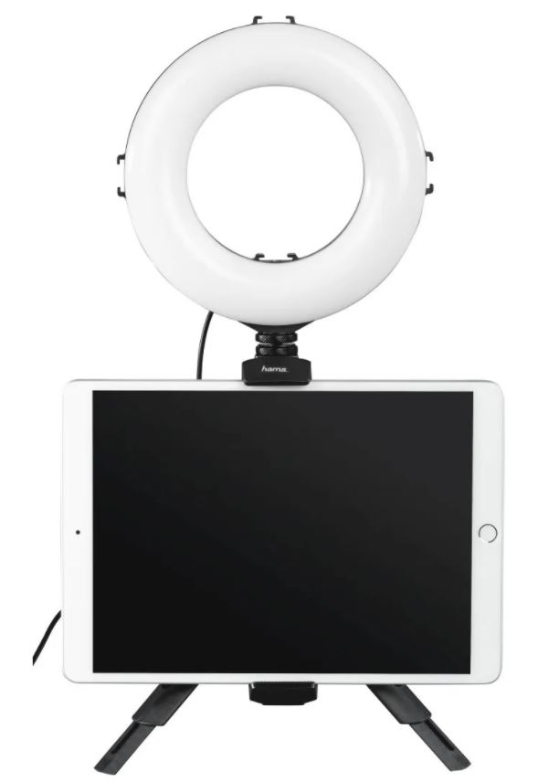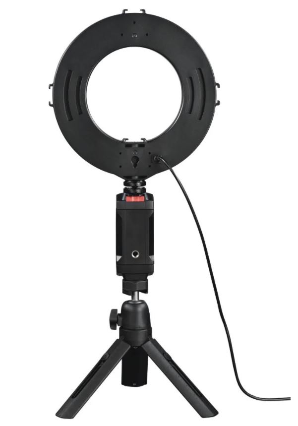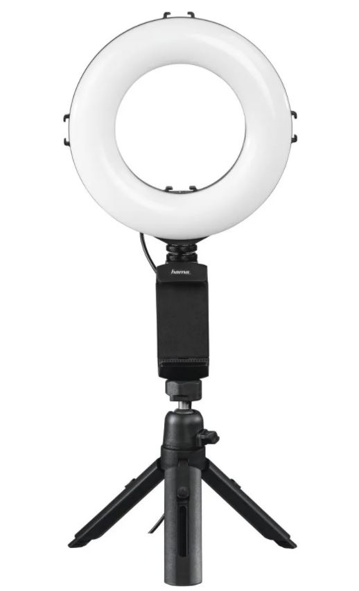 Осветитель Hama SpotLight Work Area 67. Осветитель для смартфона. Число светодиодов - 48. Диаметр кольцевого осветителя - 17 см. Число уровней затемнения - 10 уровней. Регулировка цветовой температуры 2500/3800/5500 К. Пульт дистанционного управления bluetooth. Питание от порта USB. Длина кабеля питания - 175 см. Комплектация: кольцевой светильник, штатив, пульт ДУ Bluetooth, держатель смартфона, инструкция по эксплуатации, чехол для транспортировки и хранения. Гарантия 24 мес.