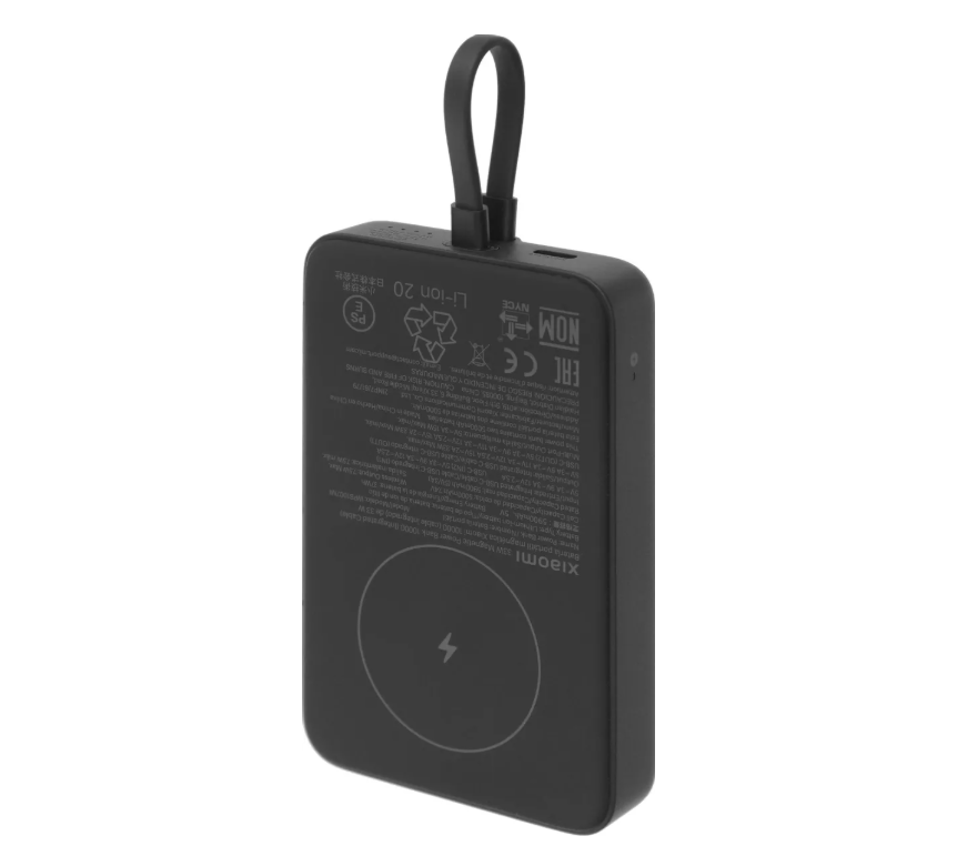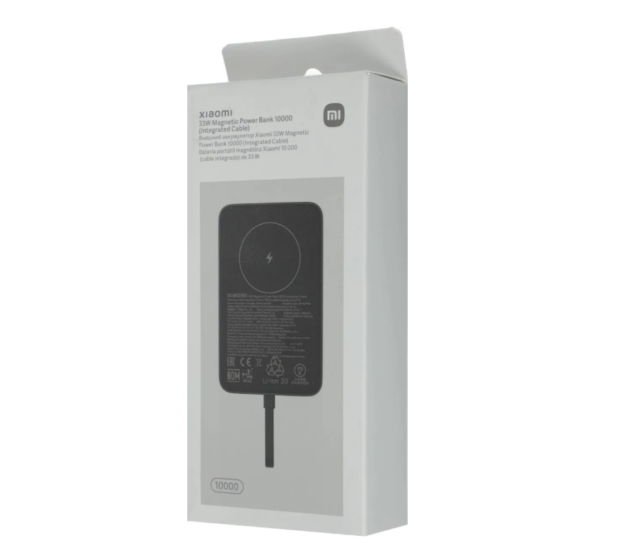 Внешний аккумулятор 10000 mAh_ Xiaomi 33W Magnetic Power Bank Gray — внешний аккумулятор (Power Bank) с ёмкостью 10 000 мАч. Оснащён встроенным кабелем USB-C, что исключает необходимость дополнительного провода. Магнитное крепление обеспечивает мгновенное подключение и зарядку без проводов. Совместим с iPhone 12 и новее, а также с телефонами Android (магнитное притяжение может быть слабее из-за конструктивных особенностей). Четыре режима зарядки: проводная зарядка мощностью до 33 Вт, магнитная беспроводная зарядка до 7,5 Вт, одновременная зарядка до трёх устройств. Быстрая самозарядка до 30 Вт — аккумулятор заряжается через два USB-C порта одновременно, полностью восполняя заряд всего за около 2 часов 20 минут. Многоуровневая система защиты (от короткого замыкания, перегрузок, перенапряжения и переразряда). Четыре LED-индикатора на корпусе показывают текущий уровень заряда. Компактный корпус с матовым покрытием и мягкой силиконовой магнитной панелью, которая предотвращает появление царапин на телефоне.