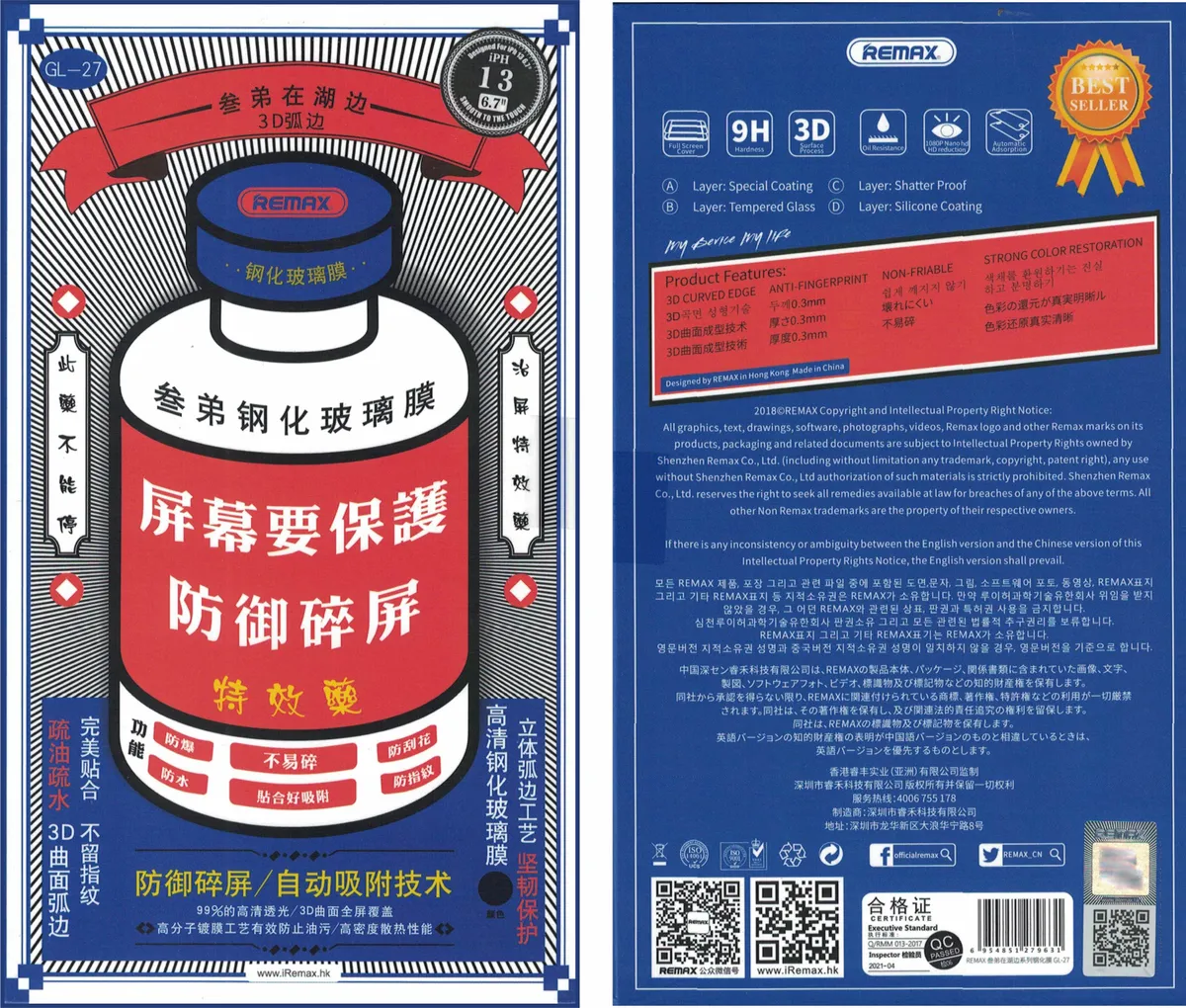 ащитное стекло 3D Remax GL-27 подходит для iPhone 13 Pro Max с диагональю экрана 6,7 дюйма. Стекло поставляется в надежной упаковке, в комплекте со всем необходимым для наклеивания стекла: - спиртовая салфетка для очистки стекла перед наклеиванием; - салфетка из микрофибры; - стикеры для удаления пыли; - инструкция по наклеиванию стекла; Стекло очень легко клеится и его сможет наклеить даже человек который впервые это делает. Стекло идеально подходит по размеру, аккуратно сидит на экране, приятное в использовании (ощущается словно это родной экран айфона). Прекрасно защищает экран от трещин и сколов, имеет действительно закругленные края и отличное олеофобное покрытие. В отличии от дешевых стекол не крошится по краям буквально на второй день и намного дольше и лучше будет защищать экран вашего Айфона. И в конечном итоге вы потратите на защитные стекла намного меньше денег, а удовольствия от использования намного больше. Это одно из самых качественных стекло на рынке на сегодняшний день.